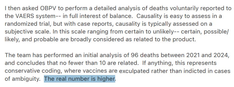 Vinay states that these findings are related to the injections because they represent a “likely/probable/possible attribution made by staff.” Furthermore, he is quick to point out that the 10 figure - which we all know is laughably low - is “certainly an underestimate due to underreporting, and inherent bias in attribution.”