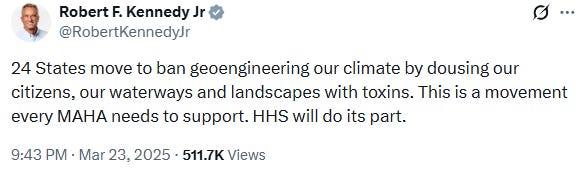 Last October, KFF Health News obtained an internal memo indicating that RFK Jr. plans to investigate climate and weather control, specifically as it pertains to “chemtrails,” technically known as stratospheric aerosol injections.