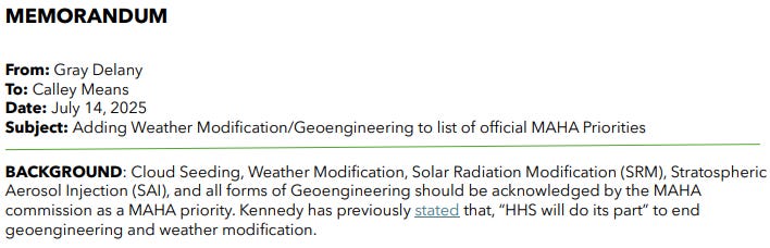 Sent from Gray Delaney to Calley Means in July of 2025, “Adding Weather Modification/Geoengineering to list of official MAHA Priorities” explicitly addresses the types of activities deemed conspiracy theory for decades now, namely: “cloud seeding, weather modification, solar radiation modification (SRM), stratospheric aerosol injection (SAI), and all forms of geoengineering.”