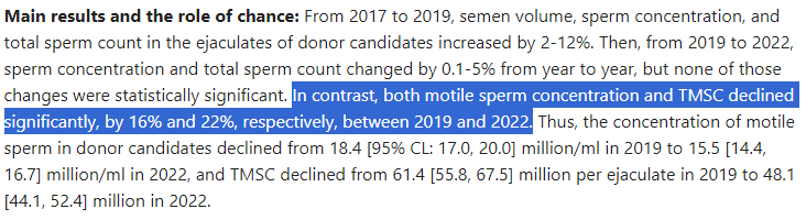 But headlines and article ‘summaries’ like to ignore this to deceive the public. “Sperm counts haven’t changed!” they’ll declare. That’s like going to a battlefield where half the soldiers are lying dead or injured, and saying, “Everyone’s still here, nothing to see!”